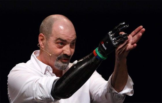 當(dāng)?shù)貢r(shí)間3月13日,西班牙塞維利亞,西班牙男子Nigel Ackland佩戴著自己的肌電(myoelectric)假肢進(jìn)行演講。Nigel Ackland原本是一名熔煉工,一次事故使他不得不進(jìn)行截肢手術(shù),裝上了肌電假肢。圖為Nigel Ackland在演講中。